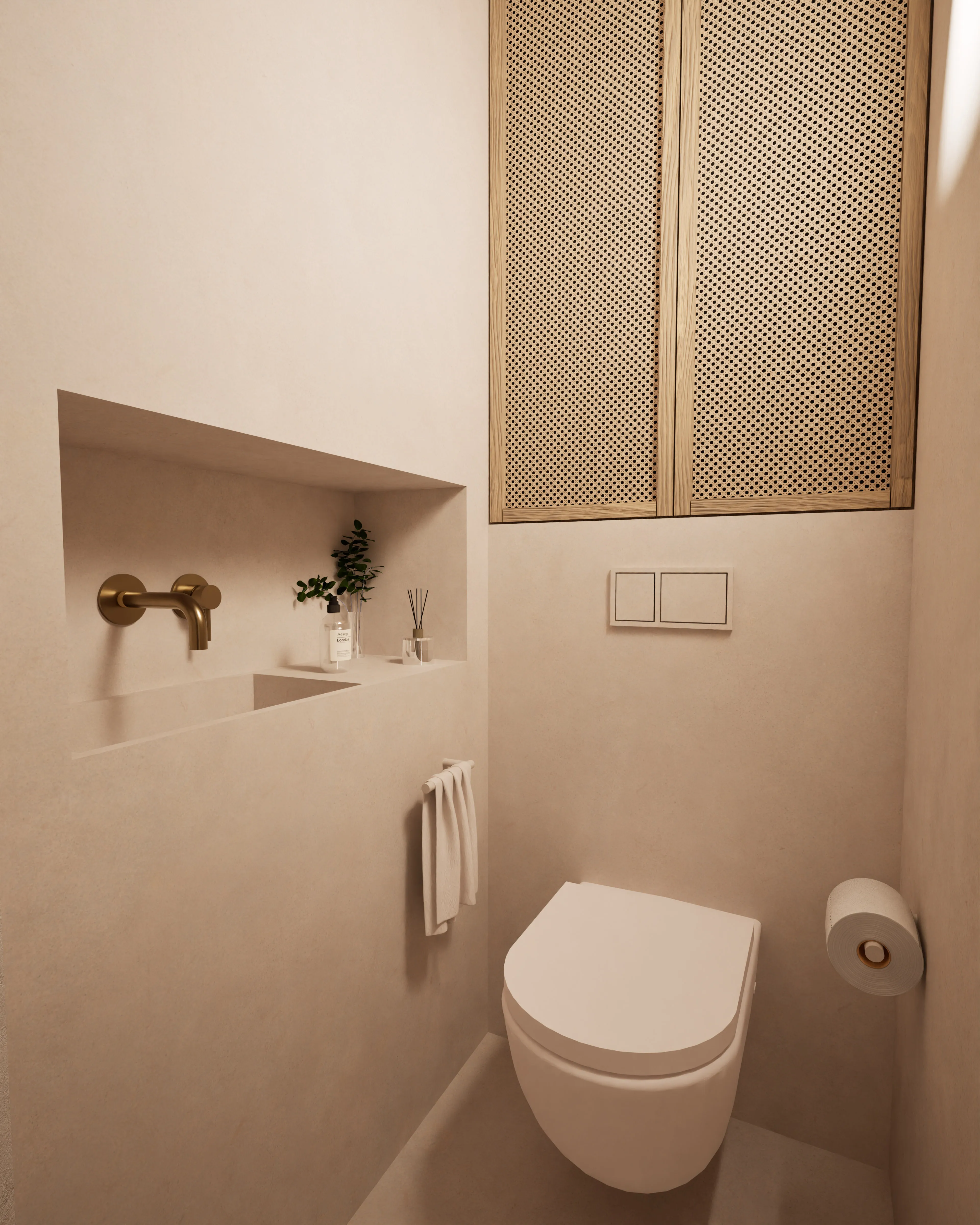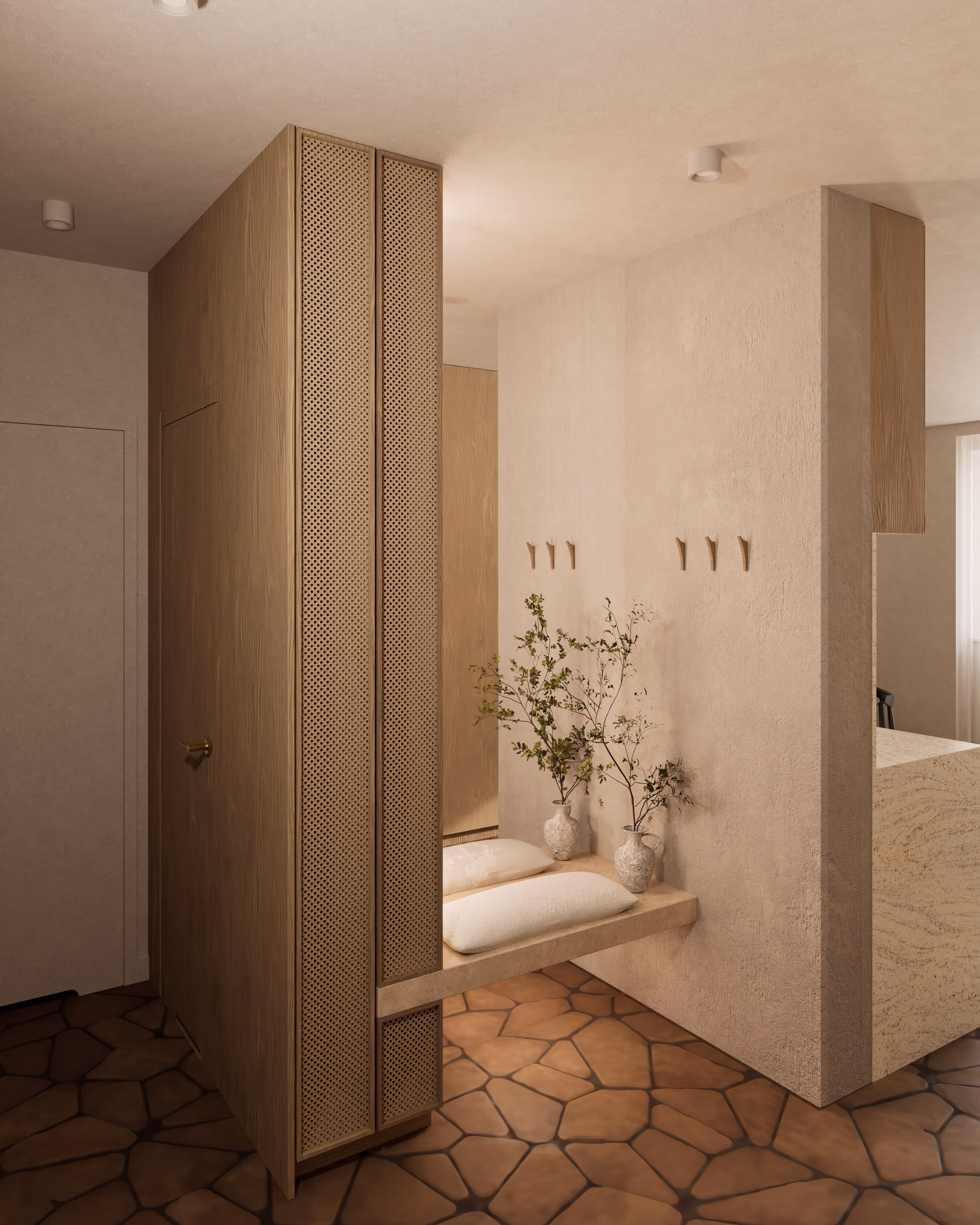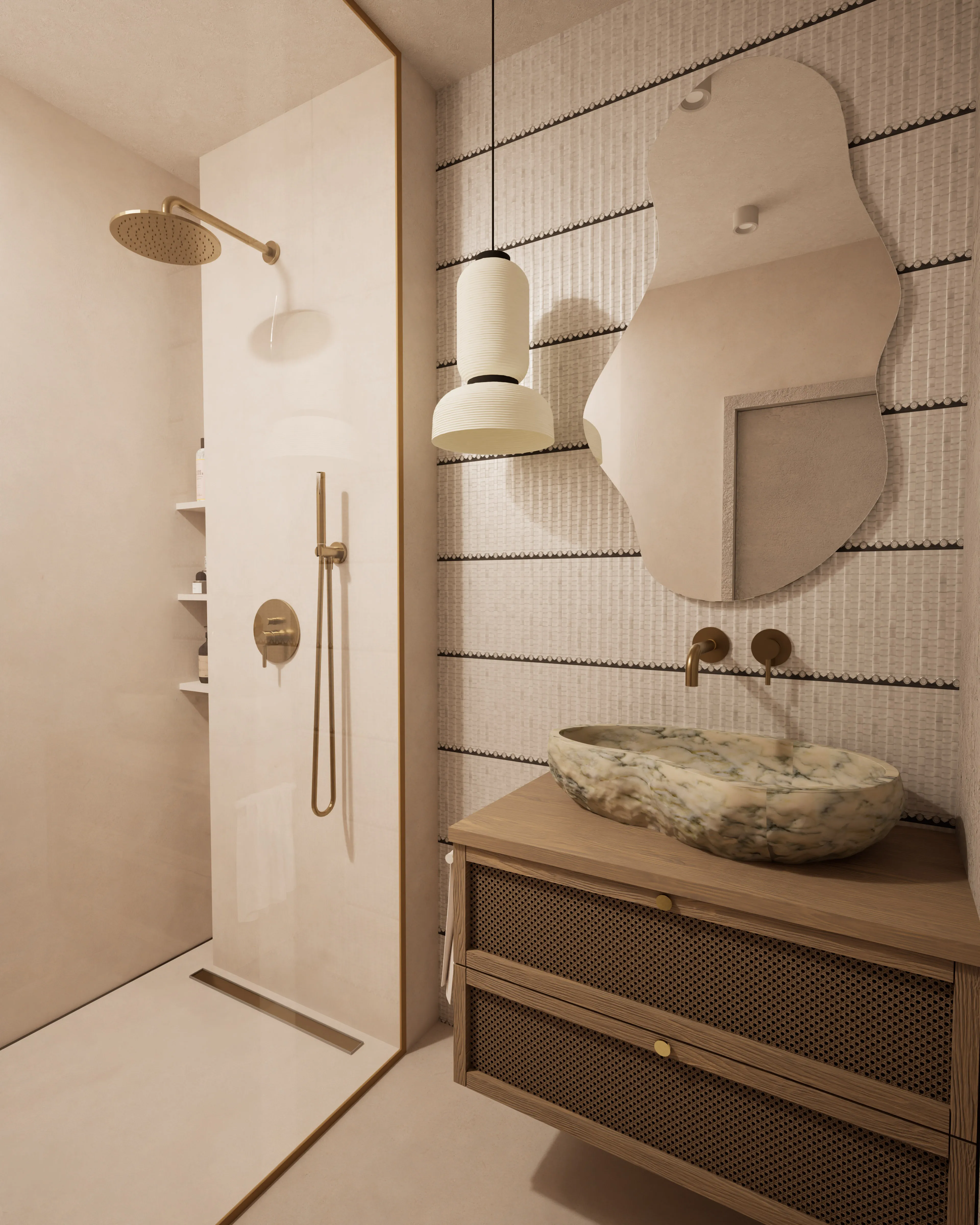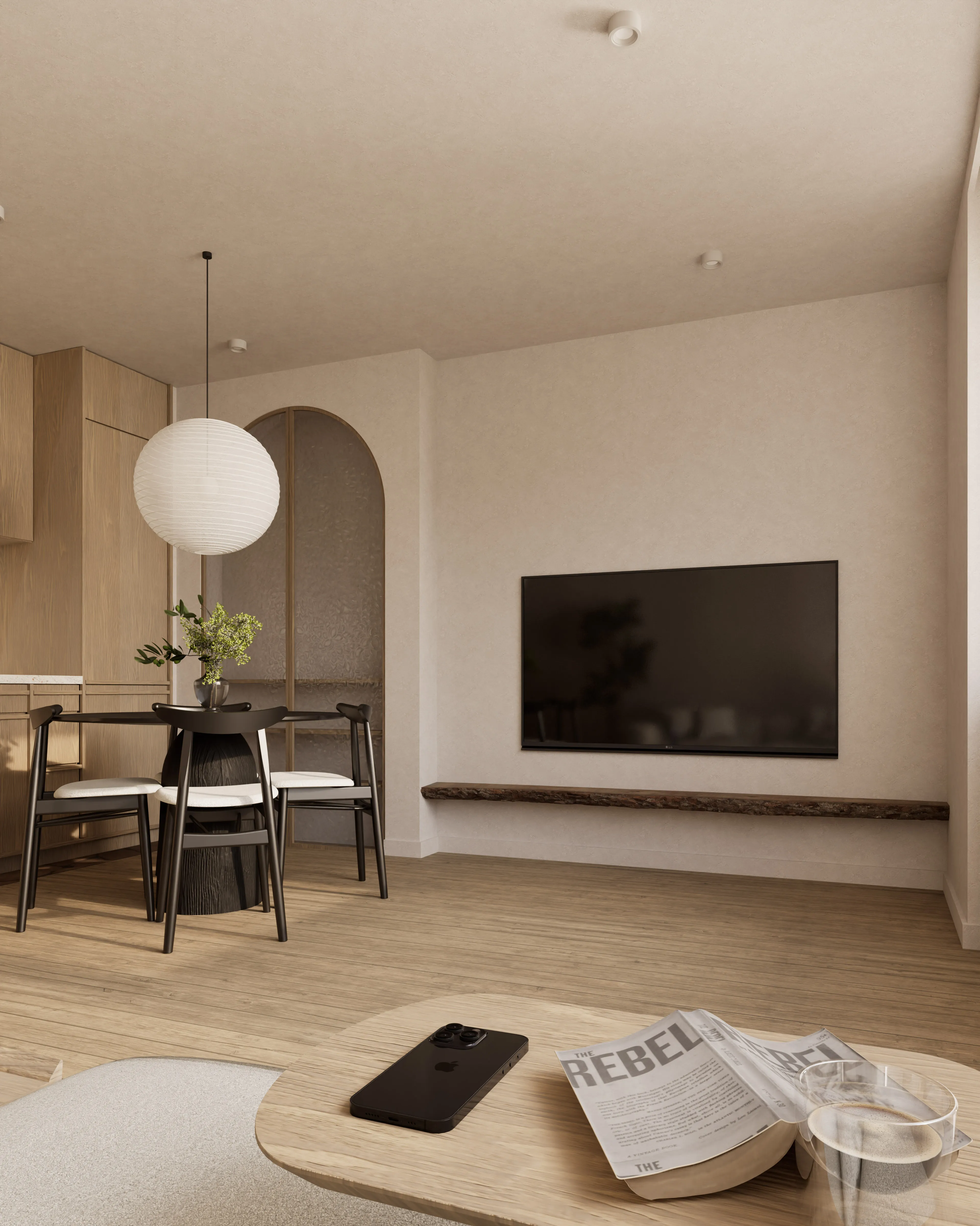Estetyka projektu opiera się na stworzeniu spokojnej, relaksującej atmosfery. Stonowane kolory i naturalne materiały budują wnętrze sprzyjające wyciszeniu. Kluczowe znaczenie ma zachowanie balansu między elementami wyposażenia a przestrzenią pustą, która działa jak naturalne remedium na przebodźcowanie i stres sensoryczny.