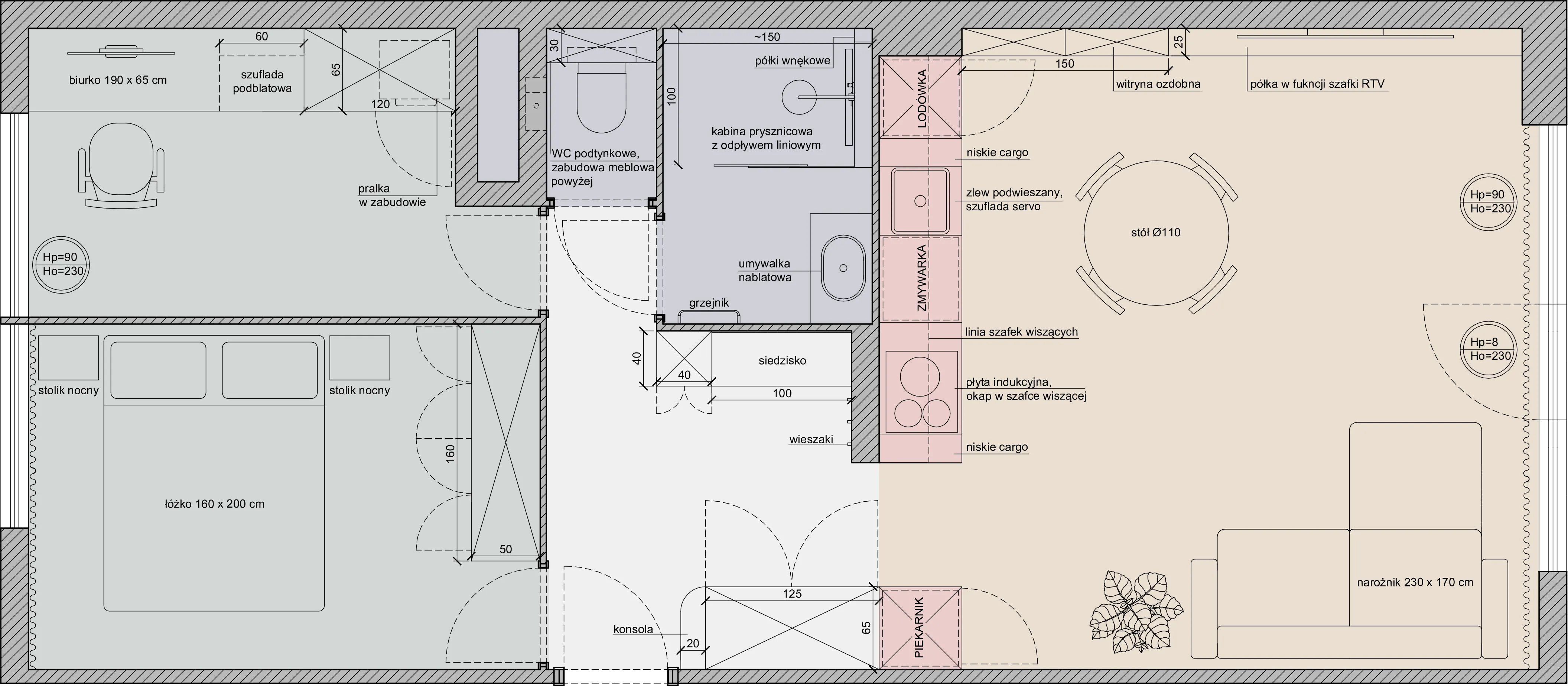 Mieszkanie pierwotnie składało się z dwóch pokoi, korytarza, łazienki, WC oraz osobnej kuchni. Dzięki odpowiednim gabarytom salonu i korzystnemu układowi pionów wodno-kanalizacyjnych kuchnię przeniesiono do części dziennej w formie aneksu, a w jej dawnym miejscu zaprojektowano wygodne domowe biuro. Część ściany między korytarzem a salonem została usunięta, a jej rolę przejęła zabudowana szafa płynnie przechodząca w słupek kuchenny z ukrytym piekarnikiem.