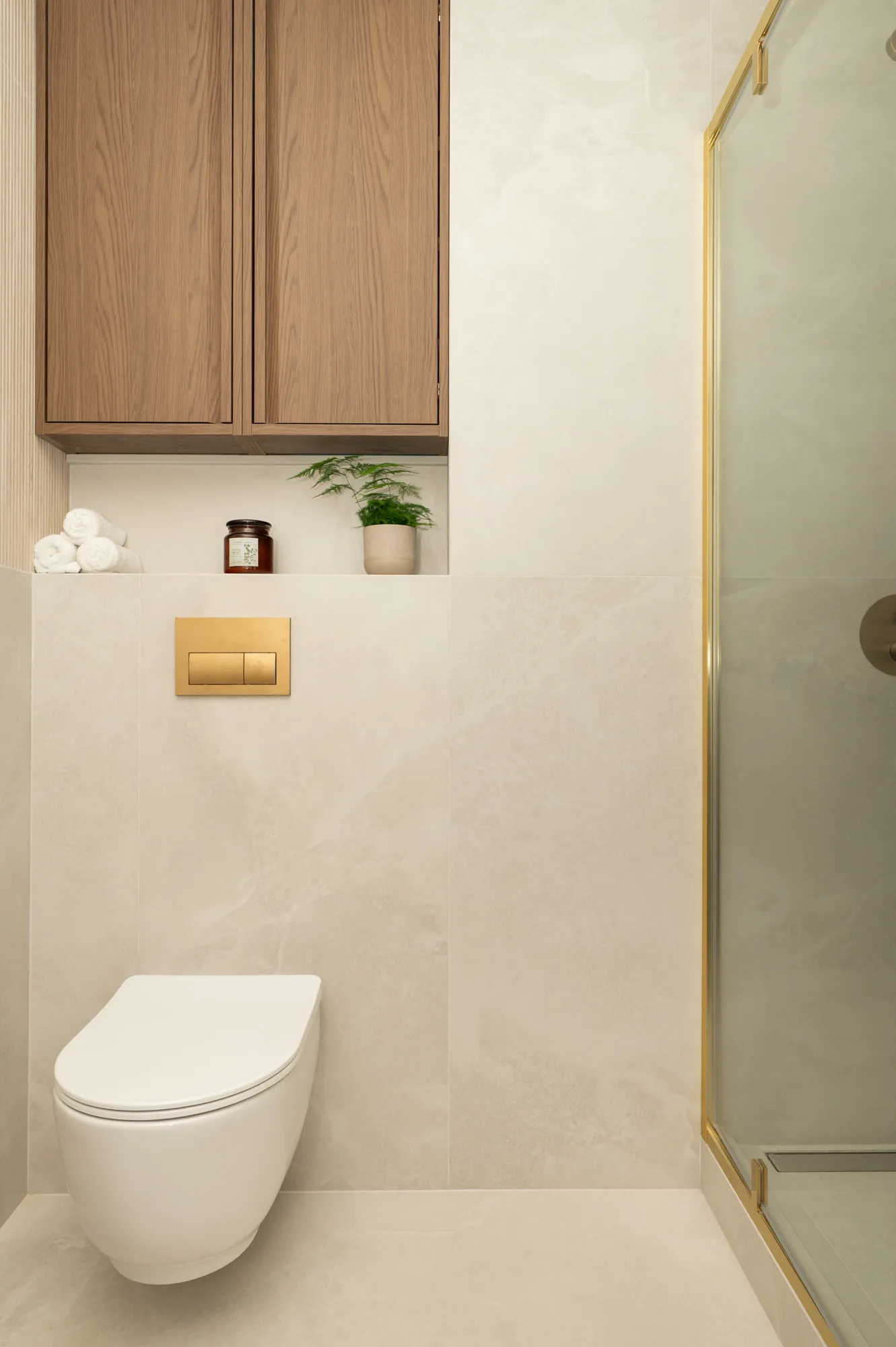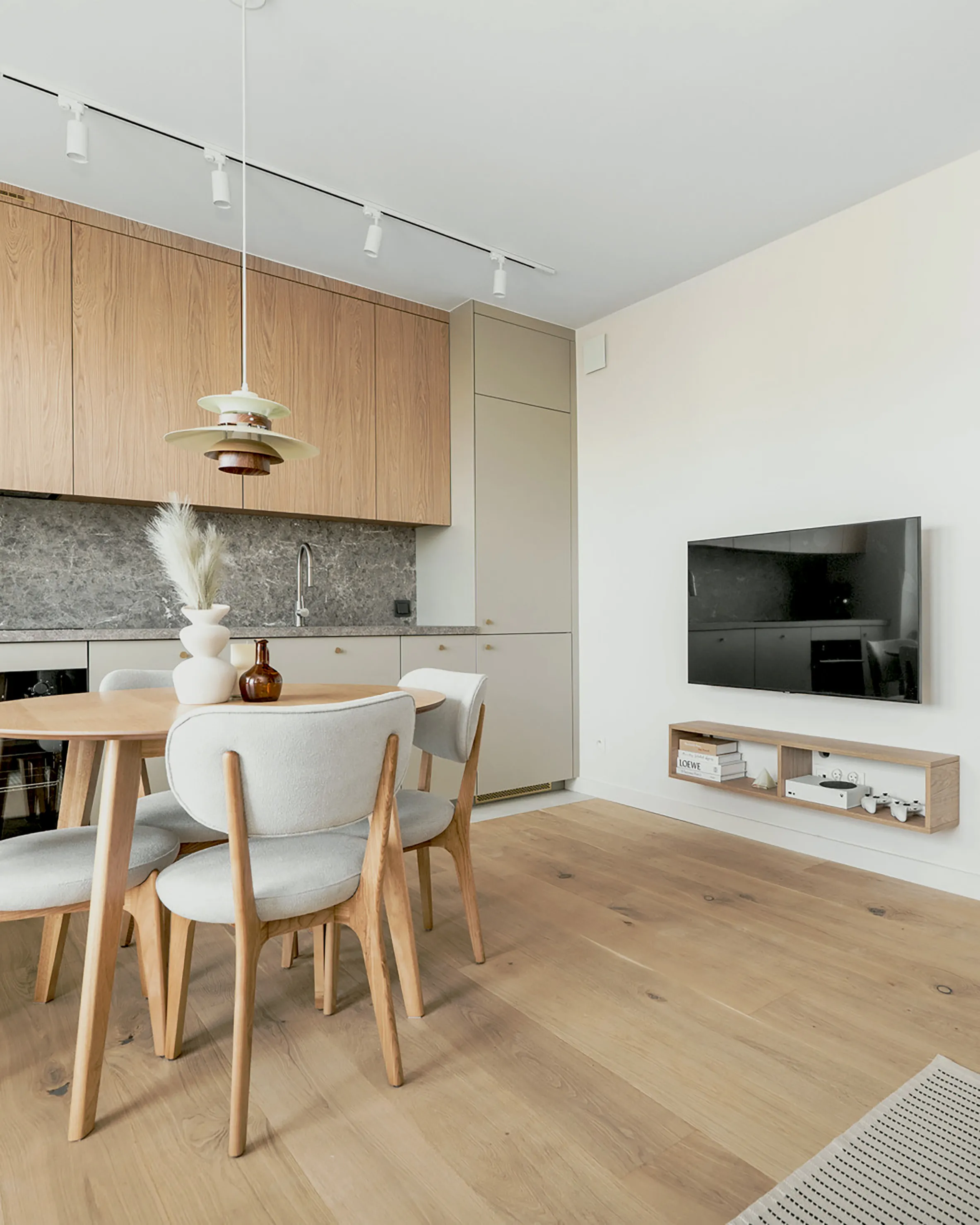 Estetyka wnętrza opiera się na prostocie i wyważeniu. Stonowana paleta barw, oszczędne formy i świadomie pozostawione „pauzy” pozwalają przestrzeni oddychać, tworząc kameralny azyl sprzyjający wyciszeniu, skupieniu i bardziej zrównoważonej codzienności.