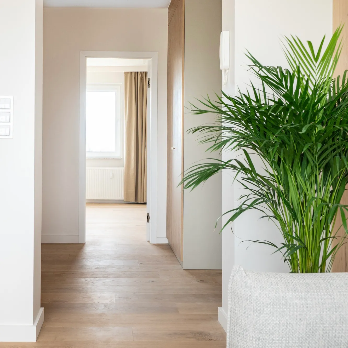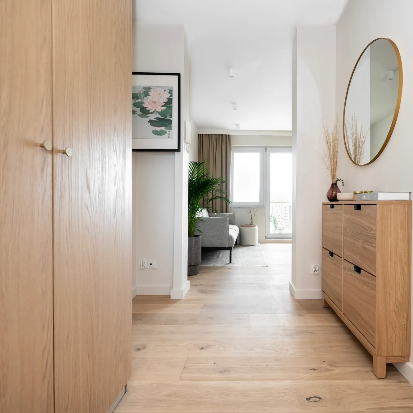 Wejście do strefy dziennej powiększono, usuwając nadproże. Dzięki temu przestrzeń zyskała na lekkości i optycznej wielkości, a linia wzroku prowadzi teraz przez otwarty korytarz aż do panoramicznego widoku z okien sypialni. Położenie mieszkania na ósmym piętrze dodatkowo wzmacnia ten efekt.