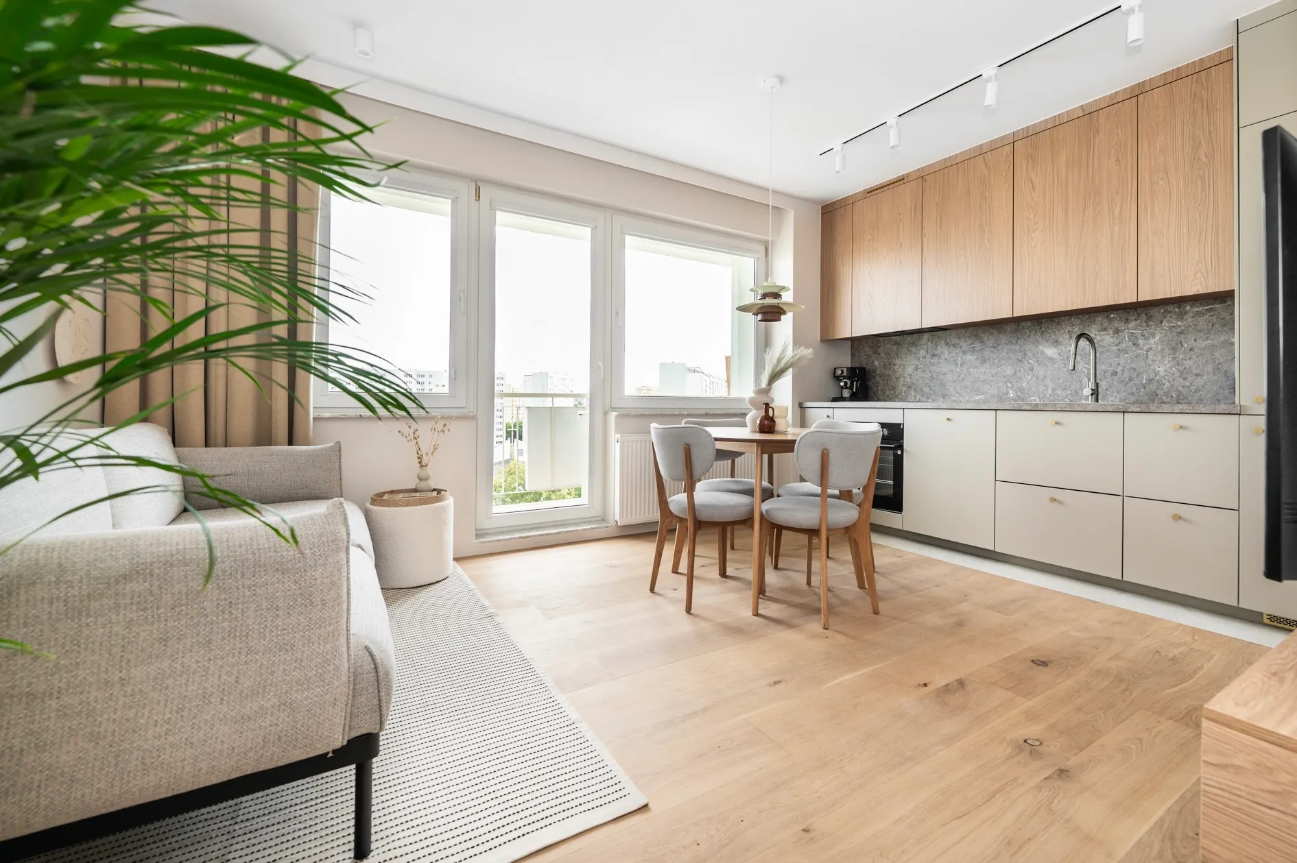 Z ciasnego, fragmentarycznego układu powstała otwarta i spokojna przestrzeń do życia — 42 m² na gdańskiej Żabiance po pełnej metamorfozie, z panoramicznym widokiem jako naturalnym przedłużeniem wnętrza.