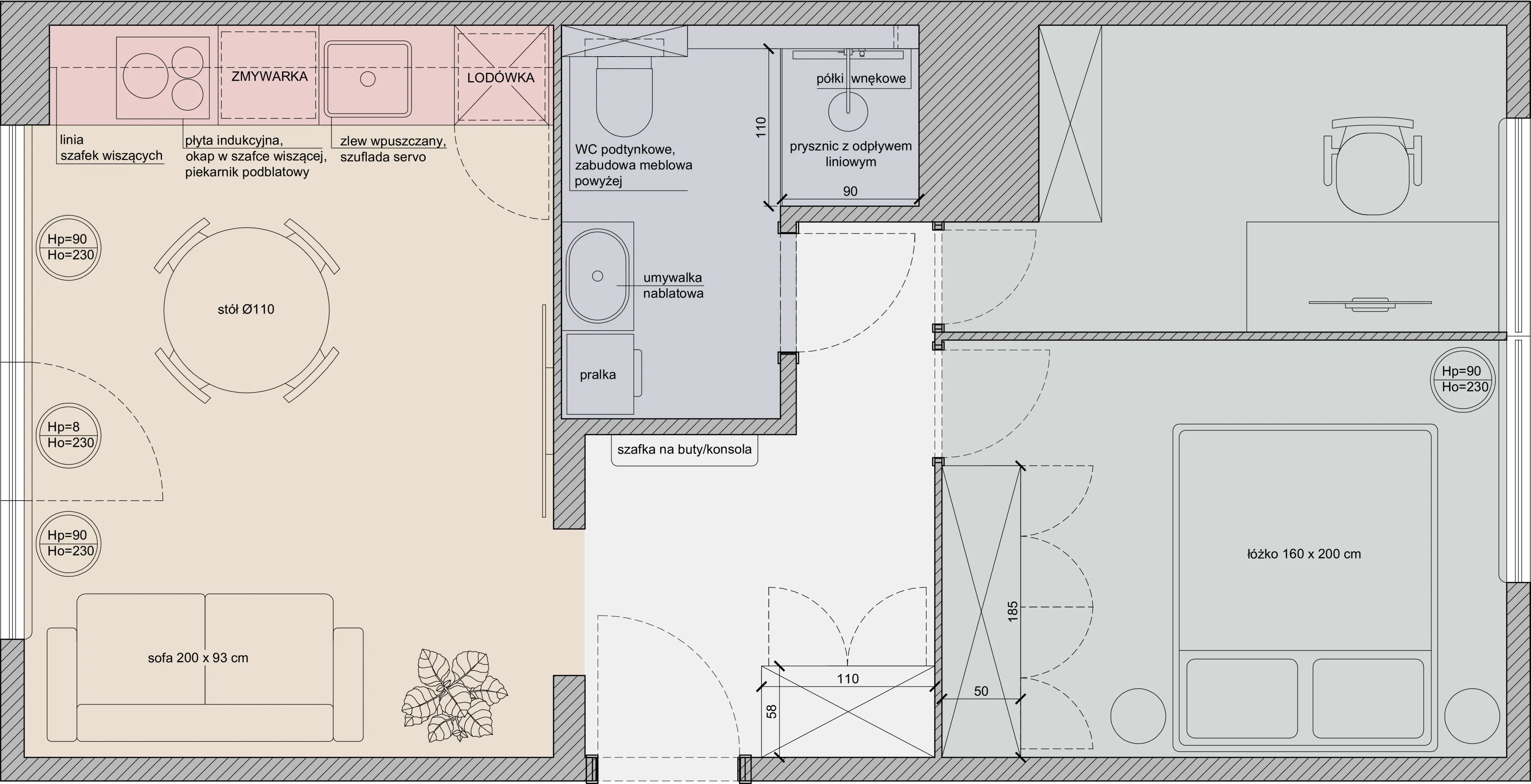 Mieszkanie pierwotnie składało się z dwóch pokoi, korytarza, łazienki, WC oraz osobnej kuchni. Pomimo niewielkich gabarytów salonu kuchnię przeniesiono do części dziennej w formie aneksu, a w jej pierwotnym miejscu — na prośbę inwestora — zaprojektowano pokój pełniący funkcję domowego biura. Strefa sanitarna została zunifikowana poprzez usunięcie ściany dzielącej łazienkę i WC, co znacząco poprawiło komfort użytkowania.
